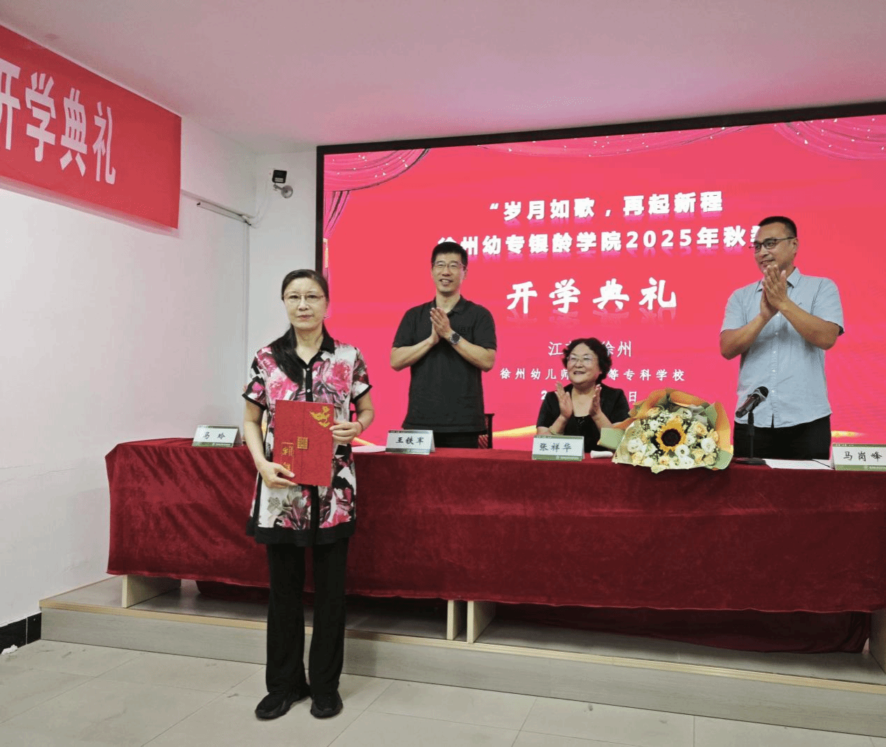 新学员代表张祥华祝贺徐州幼专银龄学院秋季学期顺利开学。她指出,这不仅是徐州幼专的一件大事,也是在座老龄人的幸事、喜事,更是退休老同志的福音。她号召银龄学员要借助幼师银龄学院的智能研修平台,重返学习时代。在学习过程中,尽情收获欢乐、成长、友谊与健康。