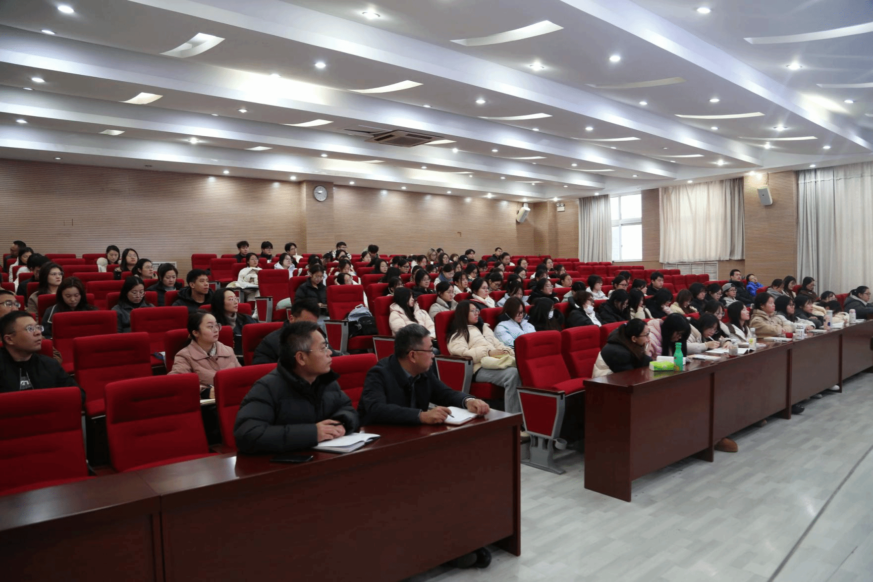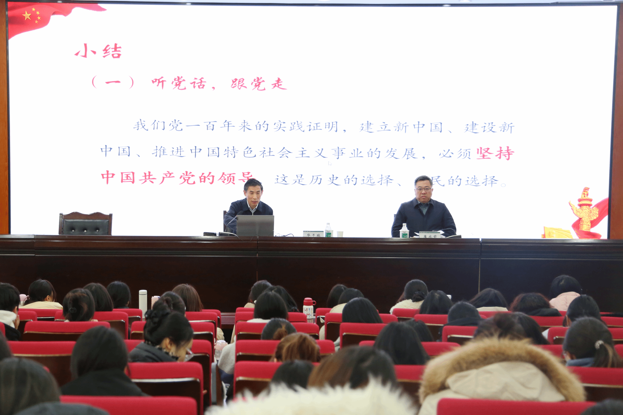 党委书记崔成前,党委委员、宣传统战部长王震,以及二级党组织书记、副书记,宣传统战部工作人员,马克思主义学院教师,辅导员和学生代表共100余人现场聆听。思政课由崔成前主持。
