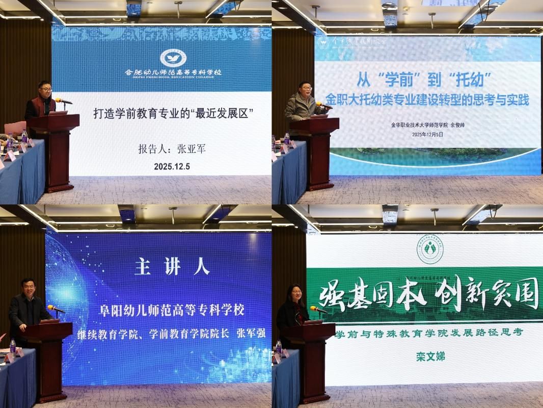 学前教育系副主任张亚军以《打造学前教育专业的“最近发展区”》为题,结合全国及合肥地区师资需求数据,明确从规范培养向前瞻高质发展的转型方向,提出以临床式培养、专业集群建设、数智技术赋能为核心的发展路径;金华职业技术大学师范学院副院长余俊帅分享《金职大托幼类专业建设转型的思考与实践》,立足新生人口变化、国家政策导向及市场供需格局,系统分析托育行业人才需求态势,详细阐述托幼专业群从“学前”向“托幼”转型的实践路径,以“五金”建设为核心,通过园校协同、产教融合等模式构建托幼一体化培养体系,为同类院校转型提供了可复制的经验;阜阳幼儿师范高等专科糖果派对官方