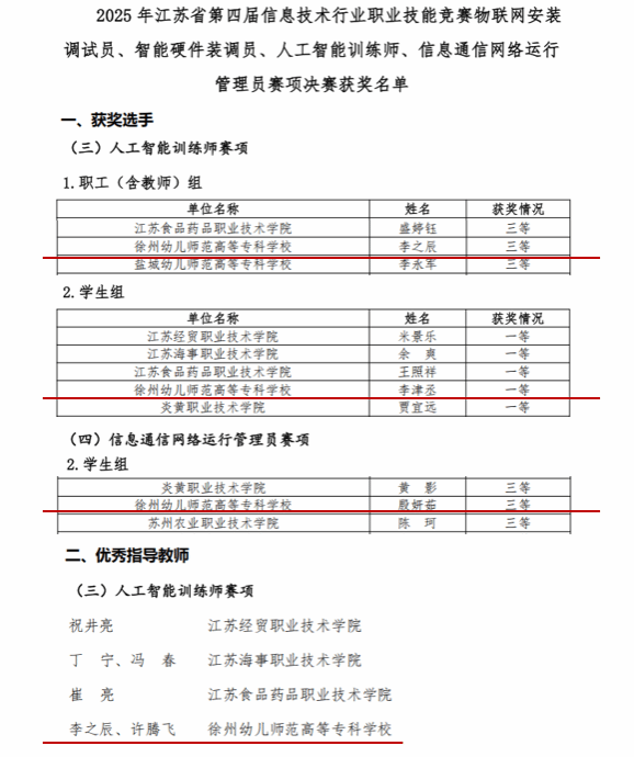 学生竞赛方面,在人工智能训练师赛项中,李津丞、司羽飞获徐州市二等奖,学生邱晓晨、周慧文、王一佳获徐州市三等奖;在信息通信网络运行管理赛项中,殷妍茹获徐州市一等奖;李雪、周金梦、杨雯迪、孟佳佳、荣山、郑家伟获徐州市三等奖。进入省赛阶段,李津丞、殷妍茹分别获省一等奖、三等奖。教师组方面,李之辰老师获人工智能训练师赛项市二等奖、省三等奖。