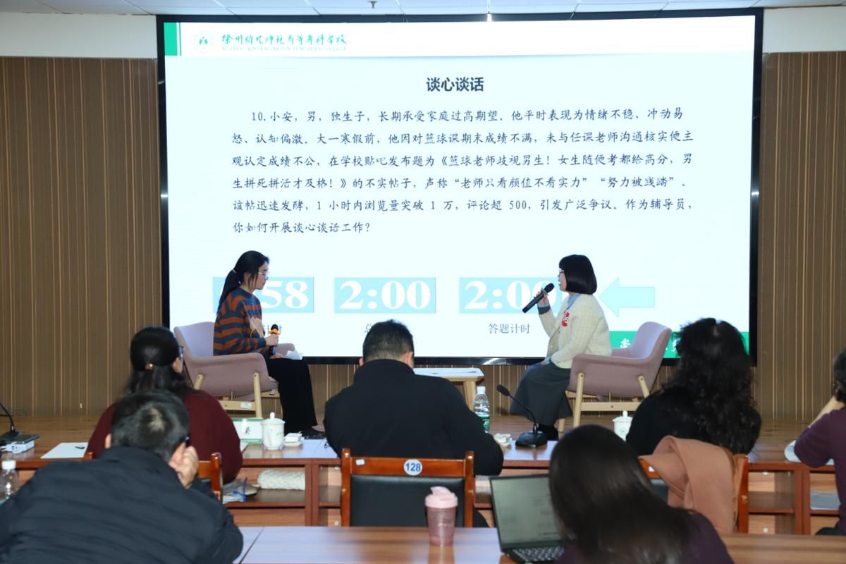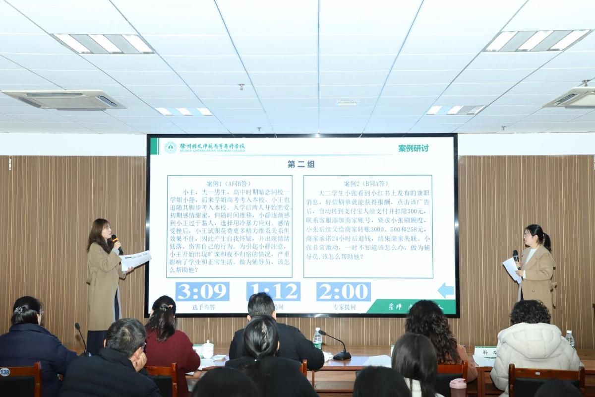 本次大赛对标省级及国家级新赛制,紧密结合新时代学生工作特点,设置了基础知识测试、案例研讨、谈心谈话三个环节。在基础知识测试中,辅导员们认真答题,展现了扎实的理论功底,通过测试,共有12名辅导员晋级决赛。在决赛的案例研讨环节,参赛选手们两人一组,以“我提问,你回答”的方式开展交互式研讨,展现了较强的业务功底与辩证思维;在谈心谈话环节中,选手面对学生耐心倾听、循循善诱,准确捕捉问题症结对学生进行教育和引导,展现了深厚的育人情怀和良好的育人水平。经过激烈角逐,体育学院胡颖、靖欣两位老师荣获一等奖,语言文化学院陈思凝、体育学院徐林楠等四位老师荣获二等奖,美术学院张枭、学前与特殊教育学院李梦雪等六位老师荣获三等奖。