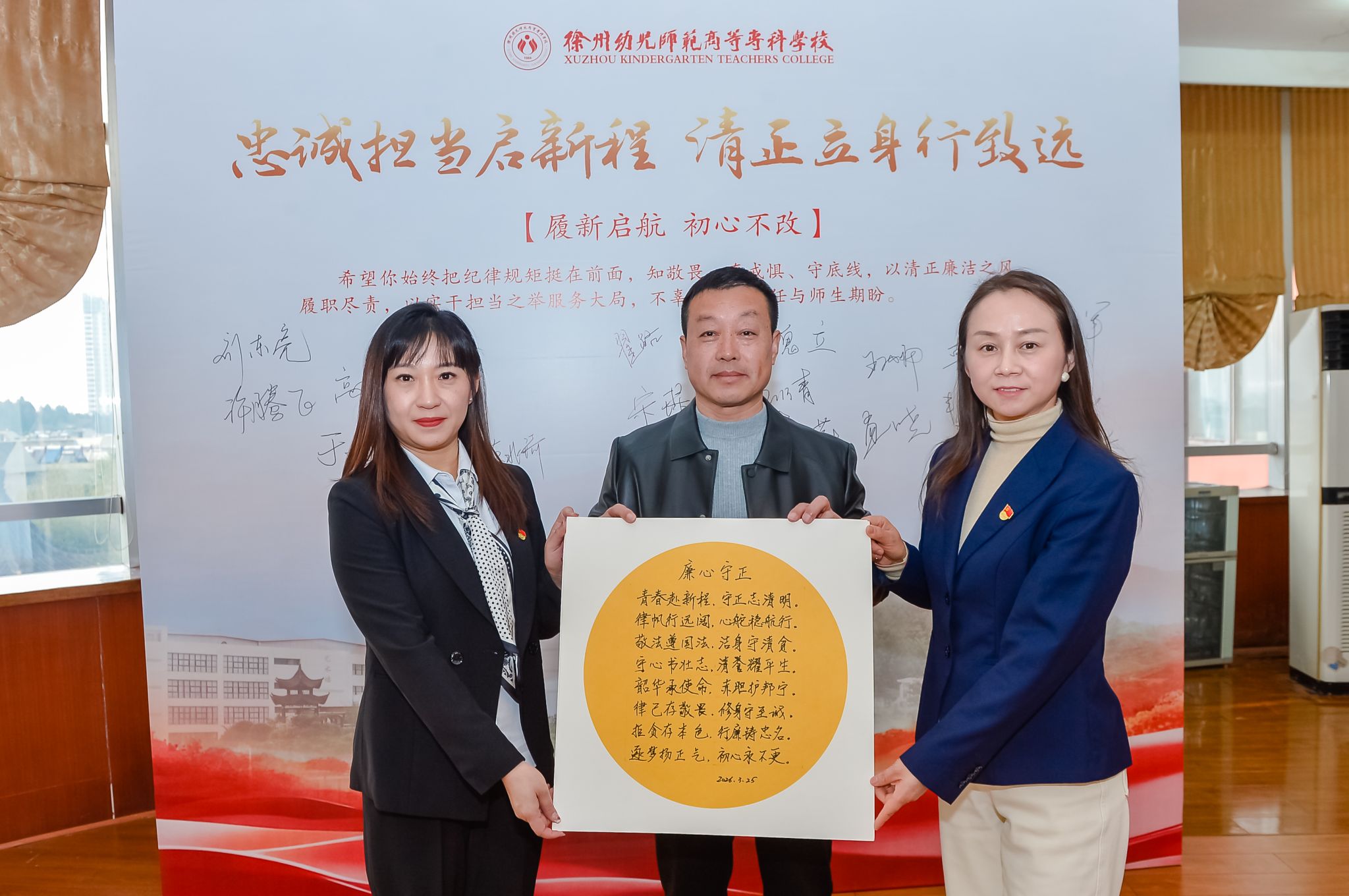 接着,全体新提任干部现场撰写廉洁寄语。校党委委员、宣传统战部部长王震、初等教育学院党支部书记、纪委办公室副主任魏峰受邀现场指导并为大家撰写寄语。大家以笔为媒,将对党忠诚的政治品格、清正廉洁的政治本色、教书育人的使命担当,融入每一句铿锵誓言之中,进一步强化了廉洁自律的思想自觉和行动自觉,在心中筑牢拒腐防变的坚固防线,以坚定的政治自信开启廉洁履职新征程。