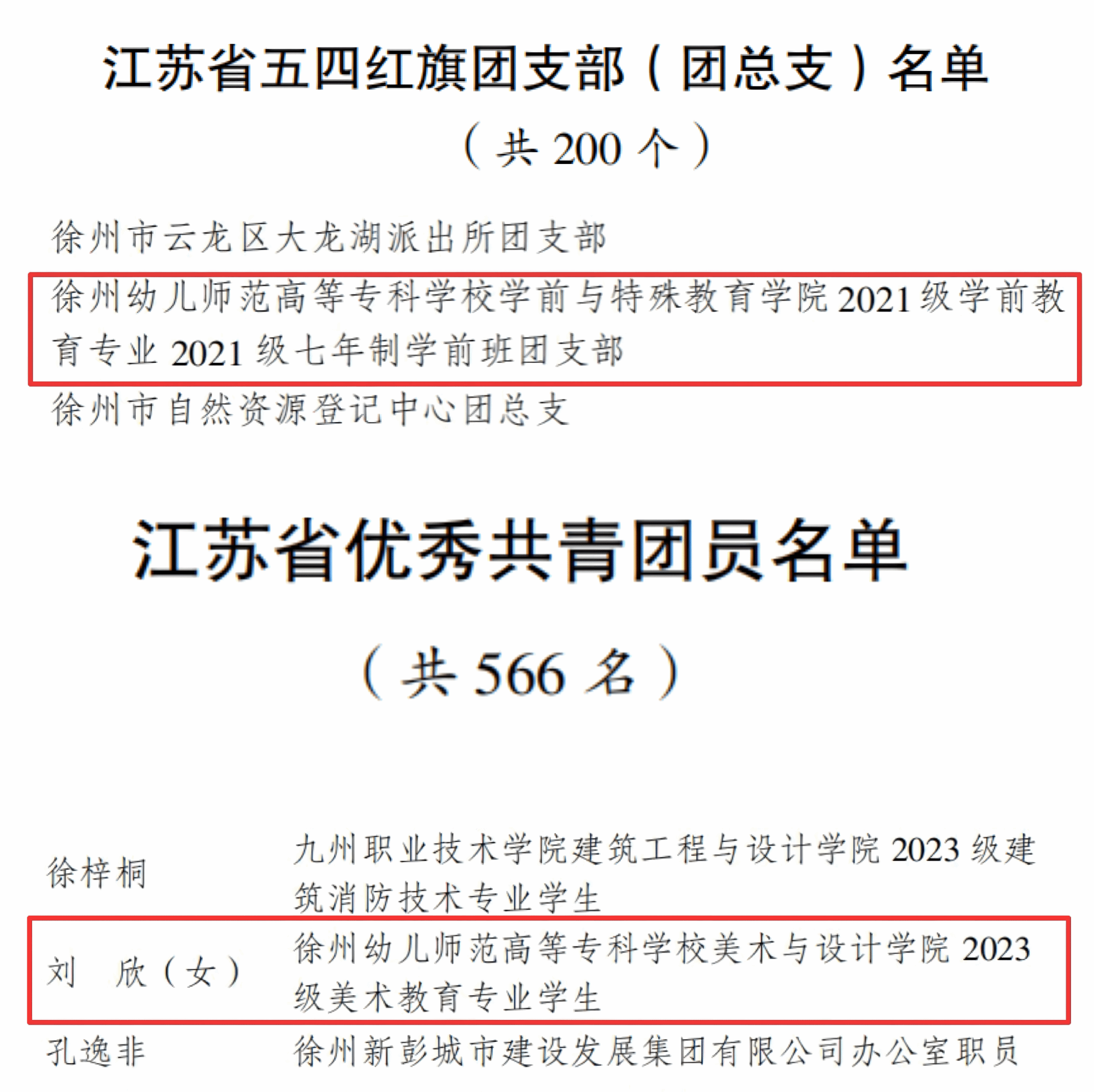 学前与特殊教育学院2021级学前教育专业七年制学前班团支部荣获“江苏省五四红旗团支部(团总支)”称号,美术与设计学院2023级美术教育专业学生荣获“江苏省优秀共青团员”称号。