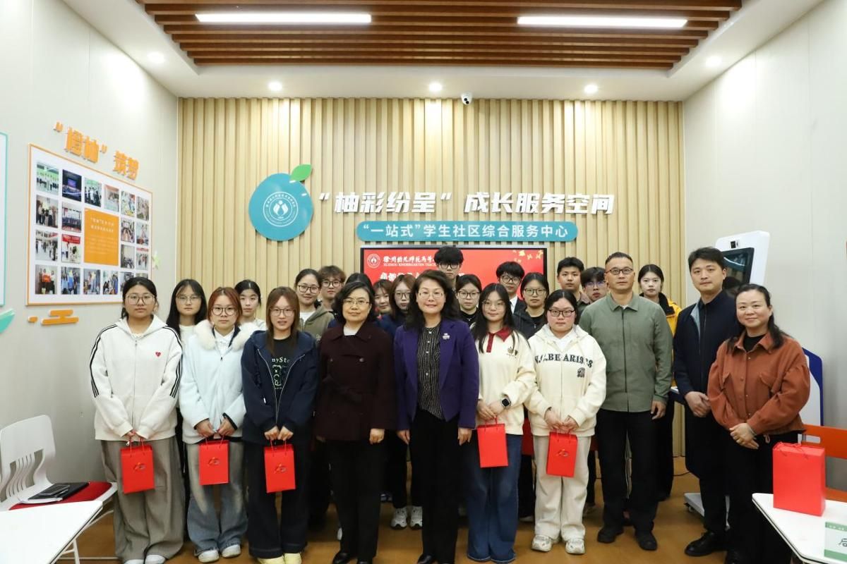 交流活动后,曹利群为与会学生赠送爱心礼包并合影留念。