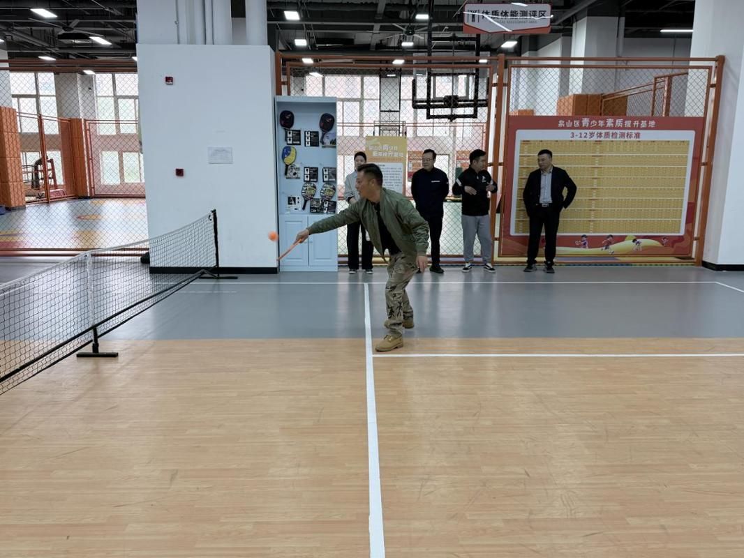 一行的到来表示热烈欢迎,并全程陪同参观场馆。叶靓详细介绍了中心整体建设规模、功能分区、运营模式、全民健身服务项目以及场馆师资配置、岗位需求、行业发展现状等核心情况,全面展示了场馆专业的运动设施、完善的配套服务与成熟的商业化运营体系。为让学院领导直观了解新兴体育业态,丰富学院专业教学与实践内容,叶靓重点介绍了匹克球运动的运动特点、大众普及优势、市场发展前景以及商业推广价值,并现场进行匹克球运动展示演示。