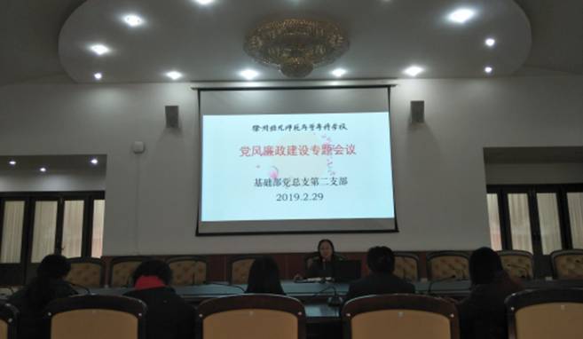 为贯彻落实党风廉政建设制度,基础部党总支第二支部于2019年2月29日在洞山校区第二会议室召开党风廉政建设专题会议。会议由第二支部书记曹清主持,第二支部全体党员教师参加会议。