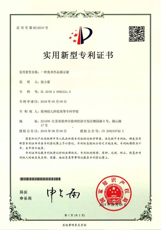 近日,美术系张小雷老师收到国家知识产权局公函,他申请的一项实用新型专利获国家批准。