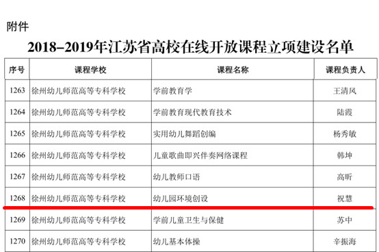 9月12日,江苏省教育厅公示了2018-2019年江苏省高校在线开放课程立项建设名单,美术系祝慧老师申报的课程《幼儿园环境创设》获批2018-2019年江苏省高校在线开放课程。课程组成员将严格按照建设标准及要求,确保项目按时高质量完成。