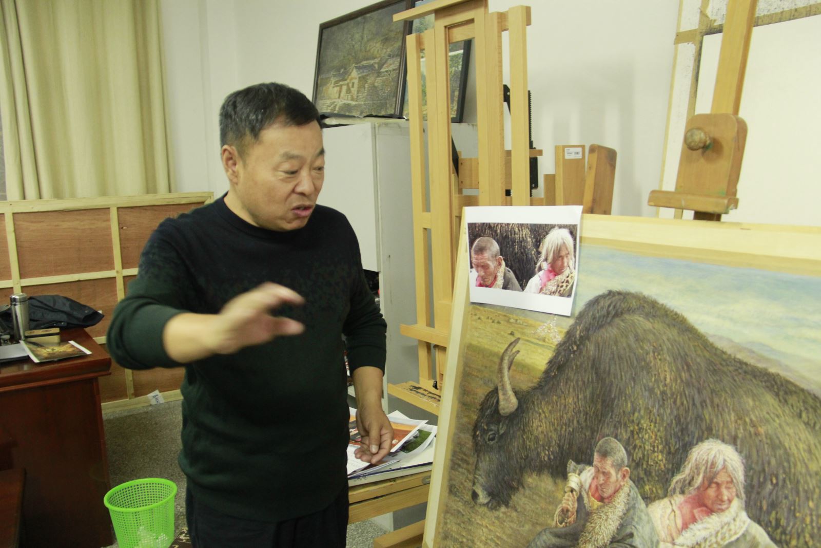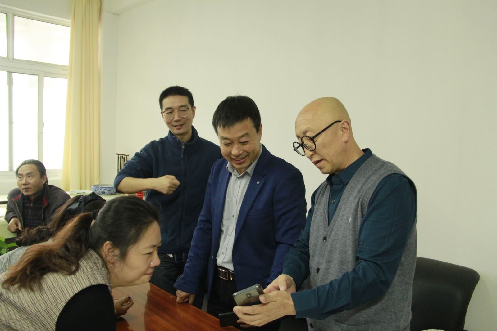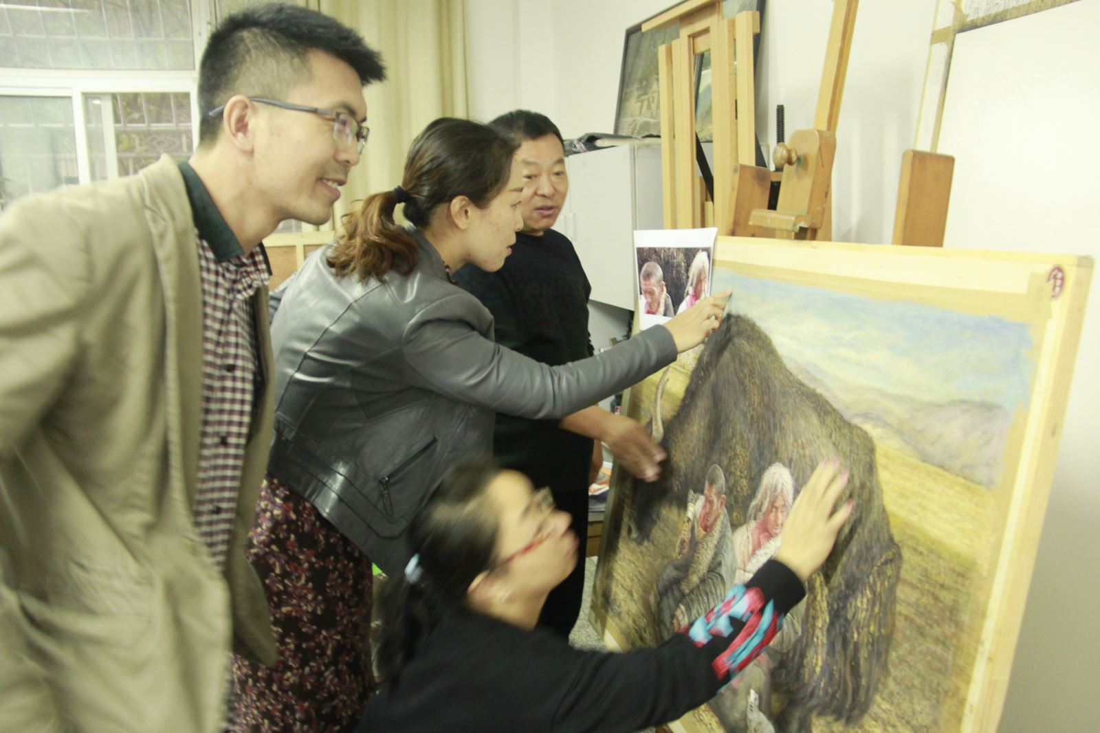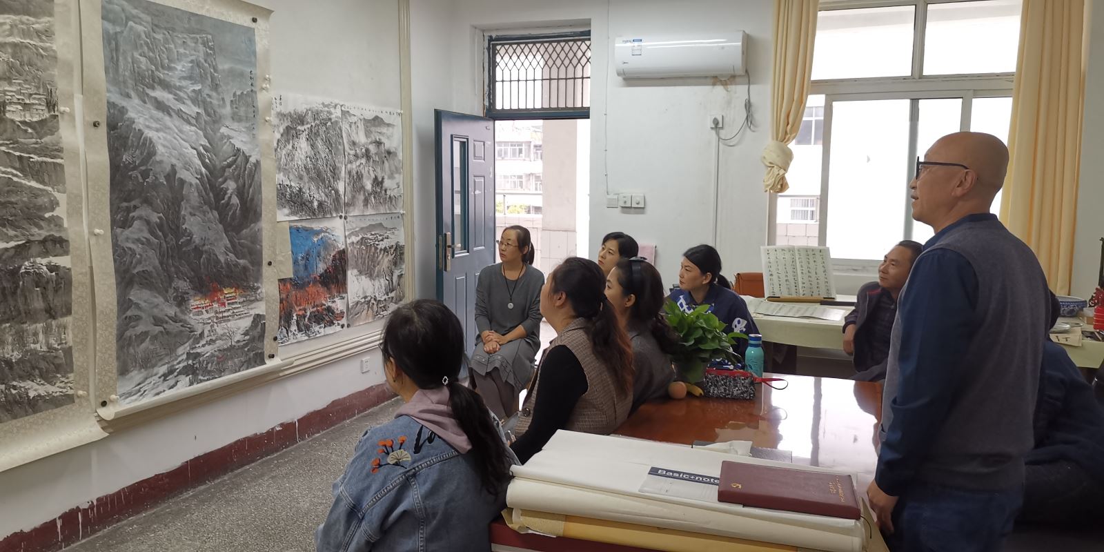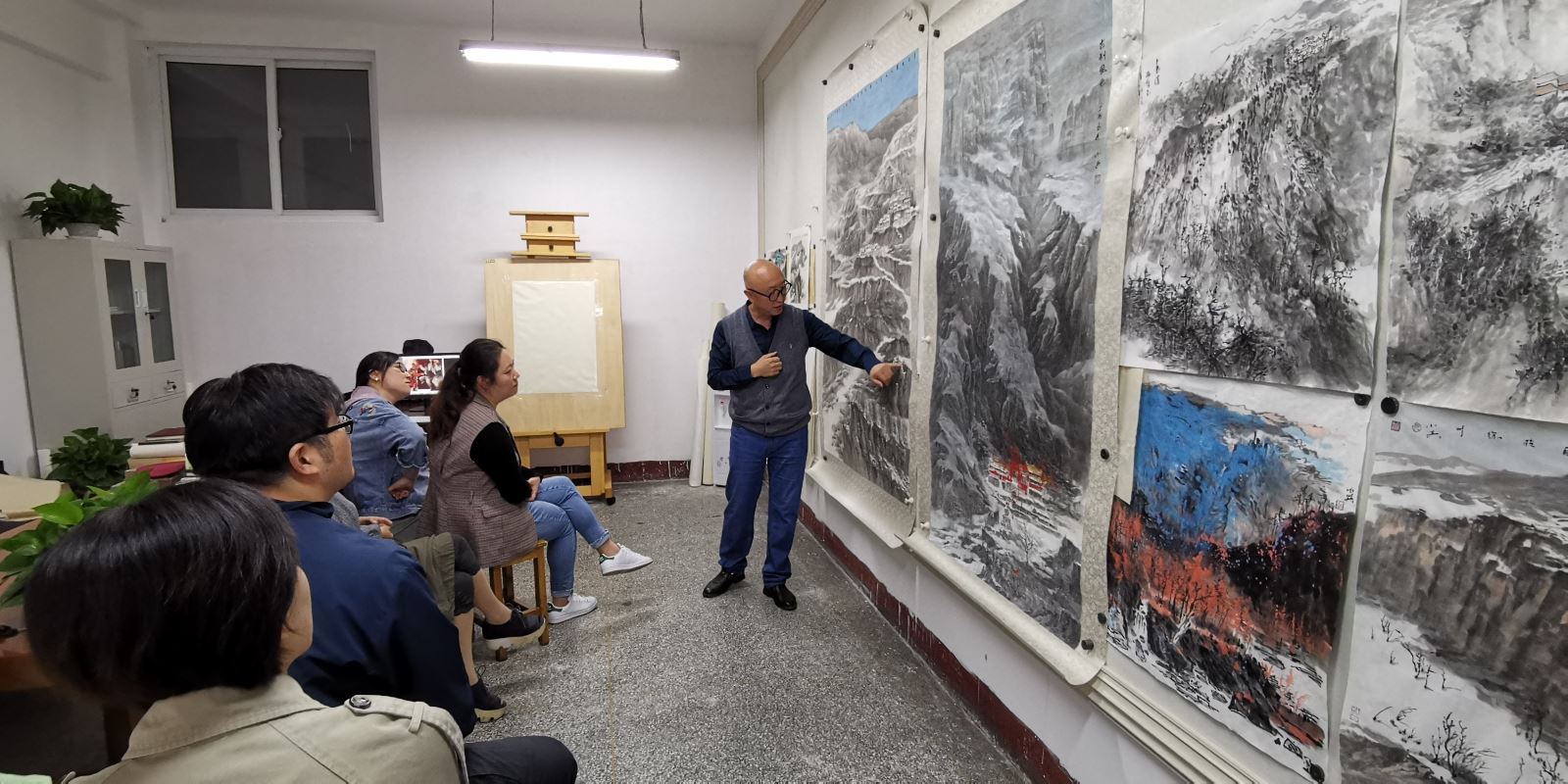 在张小兵教授工作室,张小兵教授结合历届中国美展入围的中国画作品的构图、选题、技法、色彩、意韵等,发表了自己的看法。他还结合自己创作的山水画作品与老师们互动交流,他鼓励青年教师解放思想,拓宽视野,搞好创作。老师们还交流了参观十三届全国美展中国画的感受。