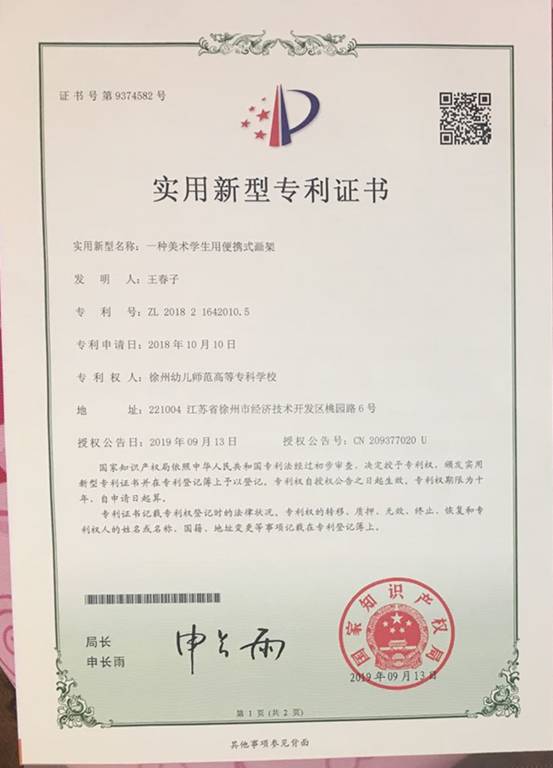 朱晓洁老师申请的实用新型专利名称为《室外写生用美术用品收纳装置》(专利号:ZL 2018 2 0781668.8,公告号:CN 208602208 U);《一种美术作品的保存装置》(专利号:ZL 2018 2 1633351.6,公告号:CN 209321643 U)。