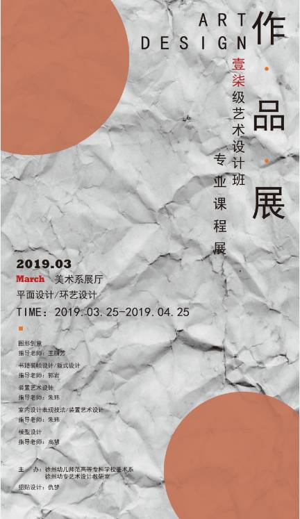 2019年03月25日,美术系2017级艺术设计专业课程作业展在美术楼一楼展厅拉开序幕,展期一个月。展览共展出2017级装饰设计专业28位同学的80余件系列设计作品,均为其专业设计必修课图形创意、书籍装帧设计、版式设计、装置艺术设计、室内设计表现技法、模型设计等课程作业,由艺术设计教研室王丽芳、郭岩、朱玮、高慧老师指导。