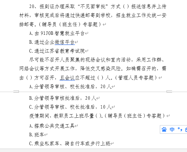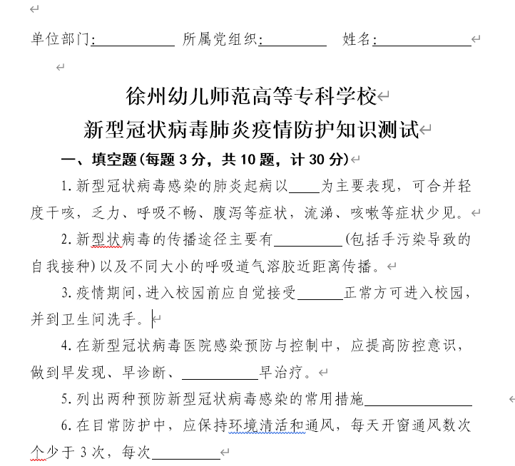 测试以网络答卷形式进行,分填空、选择、判断三种题型,针对管理人员、辅导员(班主任)、专任教师的工作特点作了区分。通过测试增强了全校教职工安全防范和自我保护意识,提高了防护能力,进一步筑牢了校园防控新冠肺炎疫情安全防线,为打赢疫情防控阻击战奠定了坚实的基础。