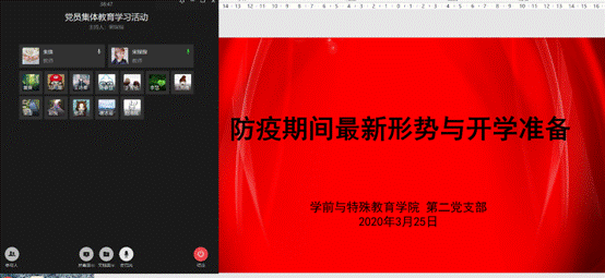 3月25日下午2:30,学前与特殊教育学院第二党支部的党员教师们以“疫情防控期间的最新形势与开学准备”为主题开展线上集体学习教育活动,确保在疫情防控的关键时期,学习“不断线”“不打烊”。