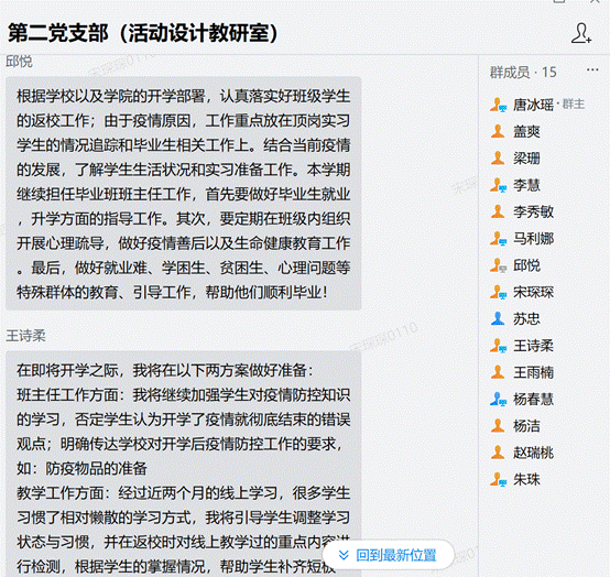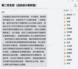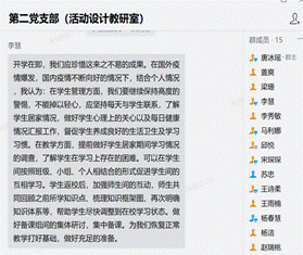 其次,党员教师们根据会前自学的江苏省教育厅发布的“开学在即!师生、家长需做哪些准备”的内容,结合本职工作畅所欲言。大家从管理、教学、班主任工作等方面纷纷提出自己的应对方法与教学计划安排等。李秀敏副院长结合学生顶岗实习与开学后的实习预案谈了自己的工作做法与计划,大力推进“实习经验分享”“考编经验分享”等云上会议沙龙。党员教师们普遍认为身为教师与班主任,一是要进行作息、心理等方面的自我调整,以饱满的精神状态迎接开学;二是有效做好线上与线上教学的对接,采取“阶梯递进、深度学习、补齐短板”的建议,开学后实施检测、试教、分层教学等形式,全面掌握学生的学习效果,扎实推进教学;三是通过云端主题班会、文章推送、线上沟通等方式,继续教育学生做好居家防疫,引导学生做好开学前的各项准备。