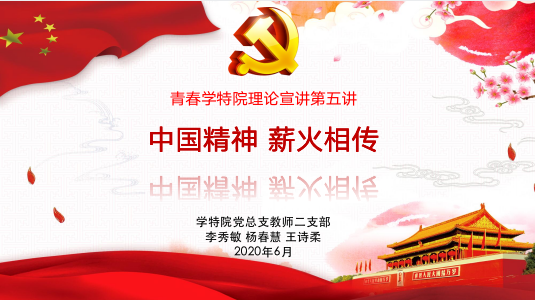 6月15日至21日,“青春学特院”理论宣讲团开展第五期宣讲活动,主题为“中国精神薪火相传”。担任本次宣讲任务的是学特院党总支教师二支部李秀敏老师、杨春慧老师、王诗柔老师和18级学前教育1班史昕冉同学。