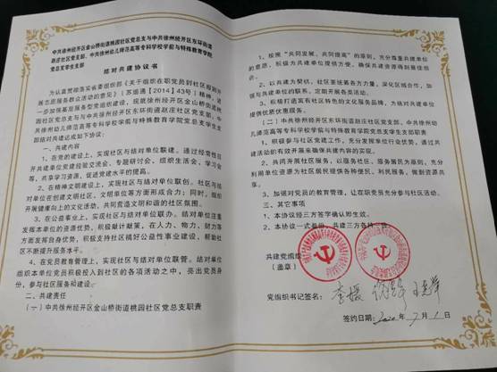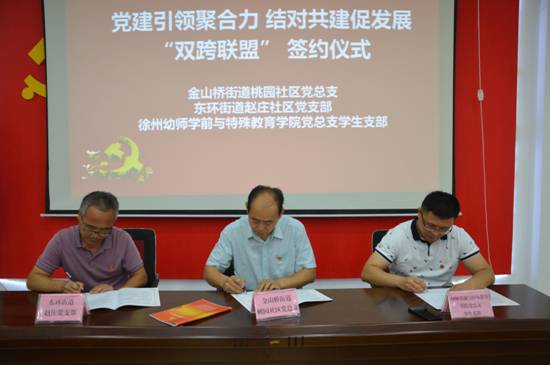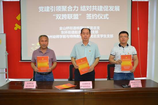 7月1日上午,党建引领聚合力,结对共建促发展“双跨联盟”签约仪式在金山桥街道桃园社区举行,学生党支部与桃园社区党总支签订共建协议。学院党总支副书记陈秋池、学生党支部书记李媛、学管办主任孙菲、桃园社区党总支书记佟辉、社区党员代表出席活动。
