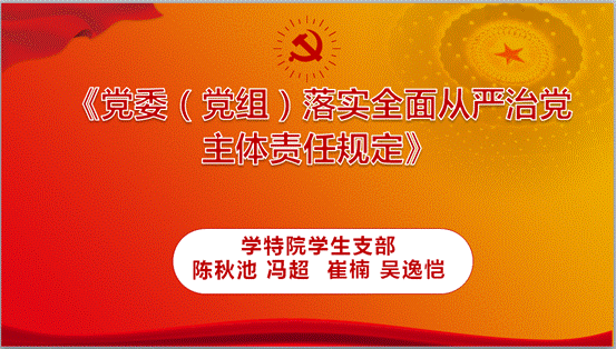 陈秋池副书记带领大家学习了《党委(党组)落实全面从严治党主体责任规定》的主要内容;冯超老师则从习近平总书记坚持群众路线与从严治党关系方面带领大家进行了学习。崔楠老师围绕遵守党的纪律做了解读;吴逸恺同学则从要领会全面从严治党的战略地位和深远意义,实现中华民族复兴的中国梦的角度进行宣讲。