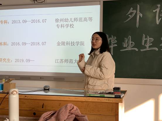 舒红学姐是外语系16届毕业生。她通过自己的努力跨过了专科,越过了本科,2019年成为江苏师范大学的一名研究生。她在三年中不停的学习,当走出校园时她不再是那个因为害怕背英语单词就想放弃学习的人了。她用她的学习经历告诉我们,不要怕,不要退缩,向前冲,不要停下自己的步伐,虽然不知道什么时候会成功,虽然不知道明天什么时候到来,但是我们会发现跑着跑着就成功了。一份耕耘一份收获。
