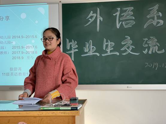 花萌老师主持了开场,刘蕙老师向大家隆重的介绍了三位优秀的毕业生。她们分别是自己创业,如今拥有一家自己幼儿园的08级学前双语专业的王雨蒙 ;坚持就业考编并找到适合自己岗位的11级英语教育专业的徐碧苒;坚持学习如今已经考上研究生的13级旅游英语专业的舒红。