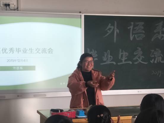12月4日,外语系优秀毕业生交流会议在碧螺c501举行。外语系主任花萌老师,就业工作负责人刘蕙老师,受邀的三位外语系优秀毕业生以及外语系同学参加了此次交流会。