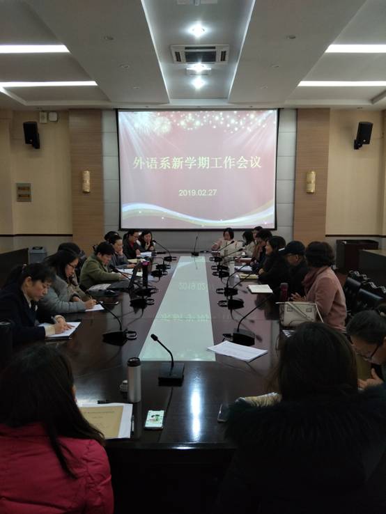 2月27日,外语系在碧螺校区A100会议室召开新学期工作会议,会议由系书记丰娴静主持,全体外语系教职工参加了此次会议,丰娴静书记和花萌主任分别进行了新学期的工作布置。