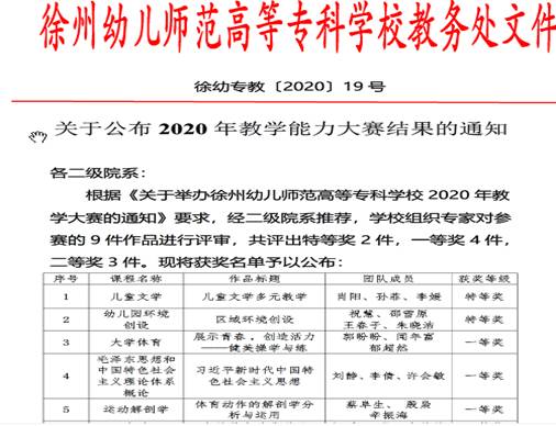 6月23日,由教务处主办糖果派对官方 2020年教学大赛在碧落校区A204举行。来自各院系和教学单位9件作品入围现场决赛。经过激烈角逐,大赛共产生特等奖2个、一等奖4个、二等奖3个。我系两个教学团队脱颖而出,郭盼盼、闻年富、郁超然教学团队作品《展示青春,创造活力——健美操学与练》和蔡阜生、殷枭、辛振海教学团队作品《体育动作的解剖学分析与运用》,分别获得大赛一等奖。