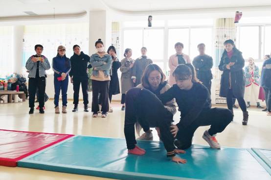 培训开始,首先观看了男、女(5、6岁)快乐体操通关赛,为了让学员更直观的了解动作要领和动作路线,教练让5岁的幼儿现场示范并讲解,且讲解了快乐体操教学和训练中的保护方法。我系学生积极参与互动,受到教练和学员的一致好评。此外,大家还学习了幼儿徒手操、集体圈操、五人徒手操等。
