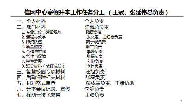 首先,王冠主任从四个层面提出升本任务的工作要求,要求大家“高度重视、端正态度;体现专业、突出成绩;守土有责、落实到位;通力合作、力求完美”;接着,详细解释了寒假期间升本任务的分工,强调责任到人、监管到位。而后,布置了工作时间安排,升本材料电子稿“三上三下”,纸质稿“一上一下”,认真落实、通力协作;最后,敦促全体教职工一定严格按照分配任务和时间节点,利用信息化管理工作(“徐州云”平台)力求完美地完成升本工作任务。