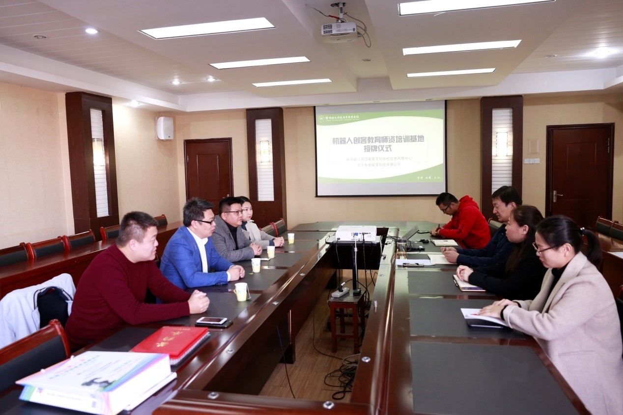 11月13日上午,机器人创客教育师资培训联盟授牌仪式在徐州幼专洞山校区208会议室举行。此次活动中,中国机器人创客教育创新联盟为徐州幼专信网中心授牌,北京智能联盟科技有限公司和信网中心负责人及教师参加授牌仪式。仪式由信网中心主任王冠主持。