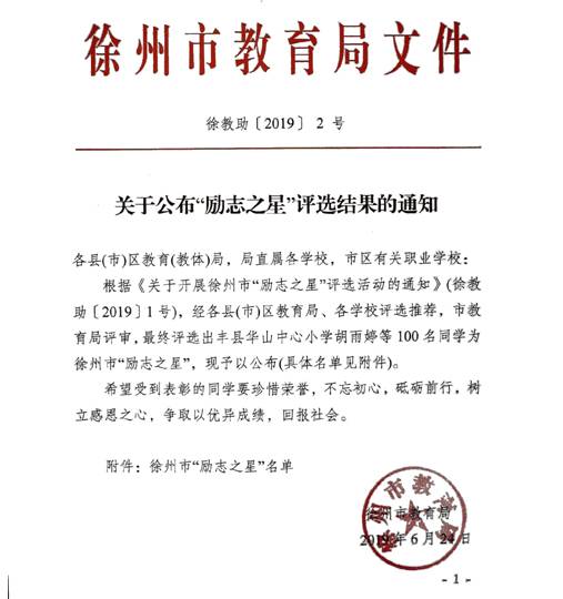 为深入贯彻落实习近平新时代中国特色社会主义思想和党的十九大精神,全面落实全国教育大会各项工作部署,进一步加强学生资助工作,弘扬励志成长成才学生感人事迹,为广大同学树立励志、感恩的榜样,引导家庭经济困难学生自立自强,立志成才,2019年5月,徐州市教育局组织开展了徐州市“励志之星”评选活动。经过各县(市)区教育局、各糖果派对官方 评选推荐,市教育局评审,糖果派对官方 2016级卓培班徐敏轩同学被评选为徐州市“励志之星”。