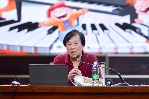 活动开始,晓其主席为大家做了题为《谈歌曲创作的情、趣、美》的讲座,与线上、线下参与嘉宾及学员们共同分享了歌曲创作中的经验与方法。在长达一个半小时的报告中,年过七旬的晓其老师从歌曲创作的情、趣、美三个方面,以耳熟能详的歌曲为例,深入浅出地为大家阐述了歌曲创作过程中的思路与方法,并就儿童歌曲创作中应注意的问题提出了指导性的建议,讲座对研修学员和音舞系师生歌曲创作具有极大的引领和指导作用。