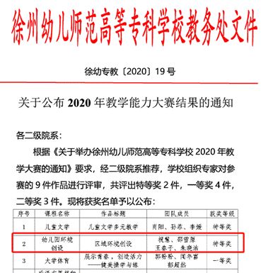 组织了这次校级选拔赛,共有9件作品获奖,由祝慧、邵雪原、王春子、朱晓洁组成的美术系团队,克服疫情带来的不利影响,密切配合,积极组织教学材料,申报的核心课程《幼儿园环境创设》的作品《区域环境创设》获得了校特等奖。