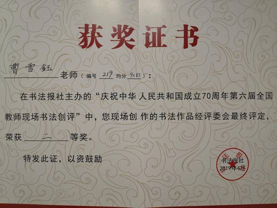 4月25日至28日,由书法报社主办的“庆祝中华人民共和国成立70周年”第六届全国教师现场书法创评暨教学论坛在北京举行,来自全国各地的312名书法教师参加了现场创评,美术系曹雪钰老师获二等奖。此次创评活动,以庆祝中华人民共和国成立七十周年为契机,旨在弘扬中华优秀传统文化,推动书法教育的普及与发展,提高书法教师的创作水平和教学水平。