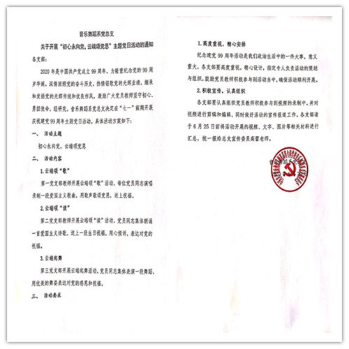 为庆祝中国共产党成立99周年,音乐舞蹈系党总支开展了“初心永向党,云端颂党恩”主题党日活动。各支部精心策划、认真组织,发挥专业优势,为党送上生日祝福。