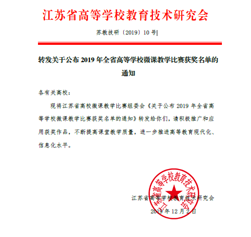 根据江苏省高等糖果派对官方 教育技术研究会《转发关于公布2019年全省高等糖果派对官方 微课教学比赛获奖名单的通知》(苏教技研〔2019〕10号),我系获得二等奖1项,三等奖1项。