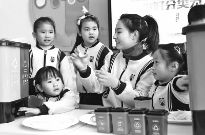 日前,江西省赣州市会昌县文清实验幼儿园趣味教学课堂上,老师在给小朋友讲解垃圾分类知识。朱海鹏摄/光明图片
