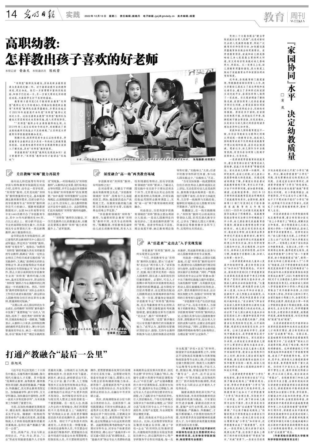 “学前教育领域的‘双师型’教师,与通常的职业教育‘双师型’教师不同,有其专业的特殊性。”陈鹏强调,学前教育是涵育幼儿成长的教育领域,具有人文性和情感性等特点,因而学前教育领域的“双师”要深入了解幼儿园实践中有关孩子日常生活的各个环节,尤其要关注其社会性情感发展的特点和规律,并将实践经验运用到职业教育课堂上,实现“高—幼”两个教育场域的深度融合。