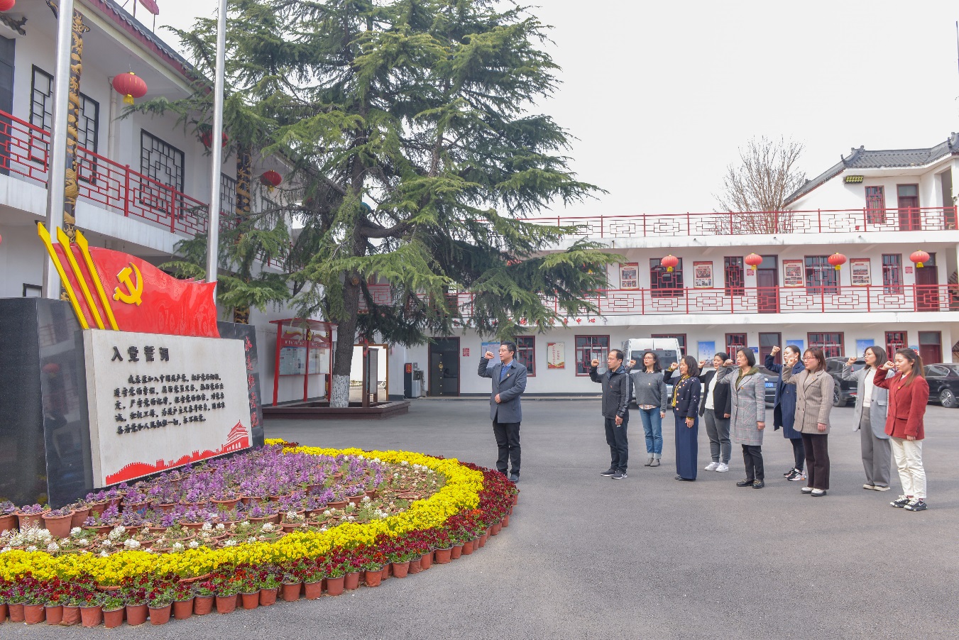 参观结束后,党员簇拥在村委会院内的党旗前,重温了入党誓词,并合影留念。党员教师们感慨改革开放以来马庄村发生的巨变,同时也表示要以此次学习活动为契机,认真学习马庄人在振兴道路上敢为人先的精神,充分发挥一个党员就是一面旗帜、一个支部就是一座堡垒的模范带头作用,以良好的工作状态、扎实的工作作风,迎接中国共产党建党100周年。