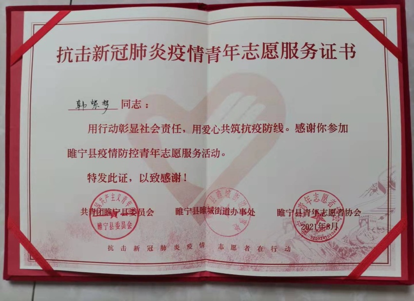 美术系学生韩紫梦积极响应共青团睢宁县委的号召,第一时间投身睢宁东城社区疫情防控检测志愿服务工作,为社区疫情防控贡献自己的力量。徐州市睢宁县电视台对此进行了专门报道。