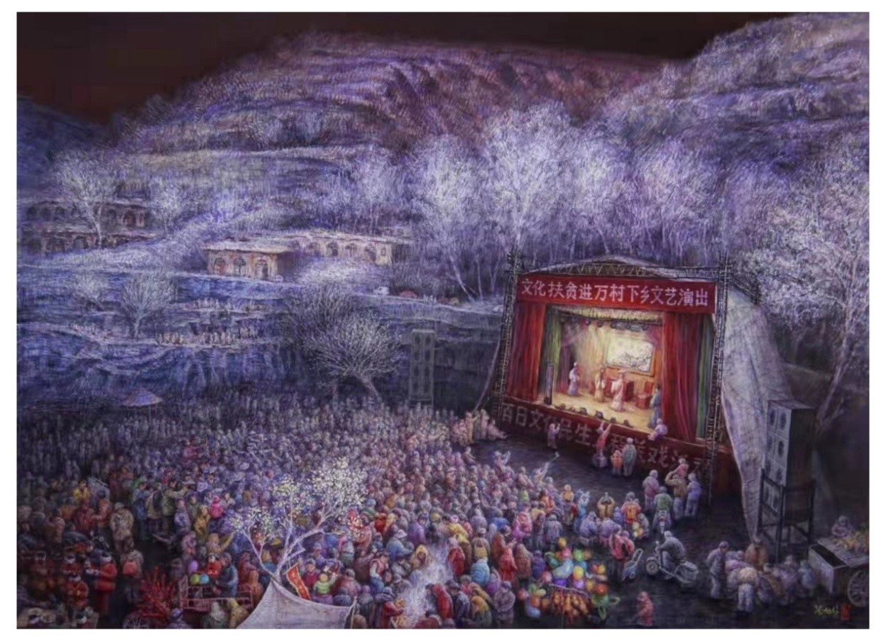 《今年好景》是张旭教授最新创作的水粉画作品,用平稳式特性构图,主观性、象征性、装饰性的色彩,大场景的造型表现,以及视野空旷、宽广的空间表现等绘画语言,讲述了文艺工作者下乡举办文化惠民演出的精准扶贫故事,作品聚焦新时代,书写新变化,反映新生活,歌颂了党的好政策。