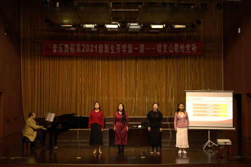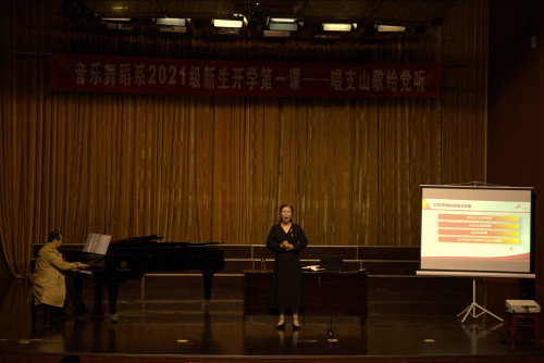 这是一堂特殊的开学第一课,音乐舞蹈系党总支第一党支部的党员教师齐上阵,通过讲授、弹奏、演唱等形式,以红色歌曲为载体,为学生上了一堂生动的党史教育课。第一党支部书记孙玉柱教授担任主讲,以歌曲《唱支山歌给党听》导入,从红色歌曲的起源与发展、红色歌曲的特点、传唱红色歌曲的意义和作用等三个方面,生动地讲述了红色歌曲的历史背景与时代意义。丁爱华教授演唱了《黄河怨》,徐丽娅、李芸芸、吴瑜、王阳等四位老师分别演唱了《唱支山歌给党听》《洪湖水浪打浪》《英雄赞歌》等耳熟能详的红色歌曲,激情洋溢的讲述、声情并茂的演唱表达了党员教师们对党的坚定信念和无限深情,让在场的同学们在红色旋律中了解红色历史,感悟红色精神。最后,同学们和老师共同高歌《我的祖国》,唱出了对祖国的热爱,唱出了信仰的力量。