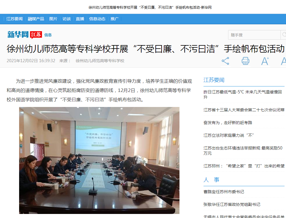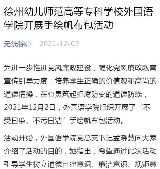 根据校党委“廉政文化宣传月”安排,为进一步强化廉政教育宣传力度,12月2日,外国语学院组织学生开展了“不受曰廉、不污曰洁”手绘帆布包活动。新华网、无线徐州等媒体对此次活动进行了报道。