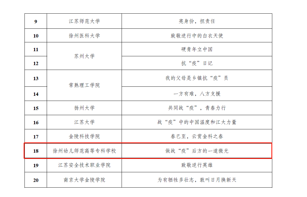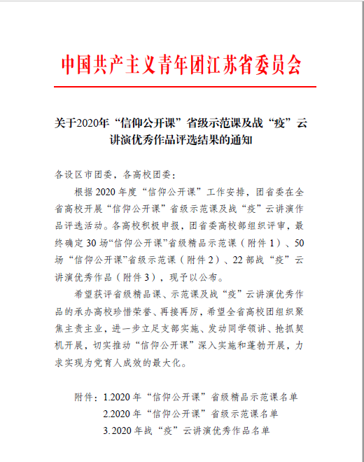 近日,共青团江苏省委公布了2020年全省高校“信仰公开课”省级示范课及战“疫”云讲演作品评选活动结果,糖果派对官方 申报的《做战“疫”后方的一道微光》获评全省战“疫”云讲演优秀作品,全省共22项作品获评此项荣誉。